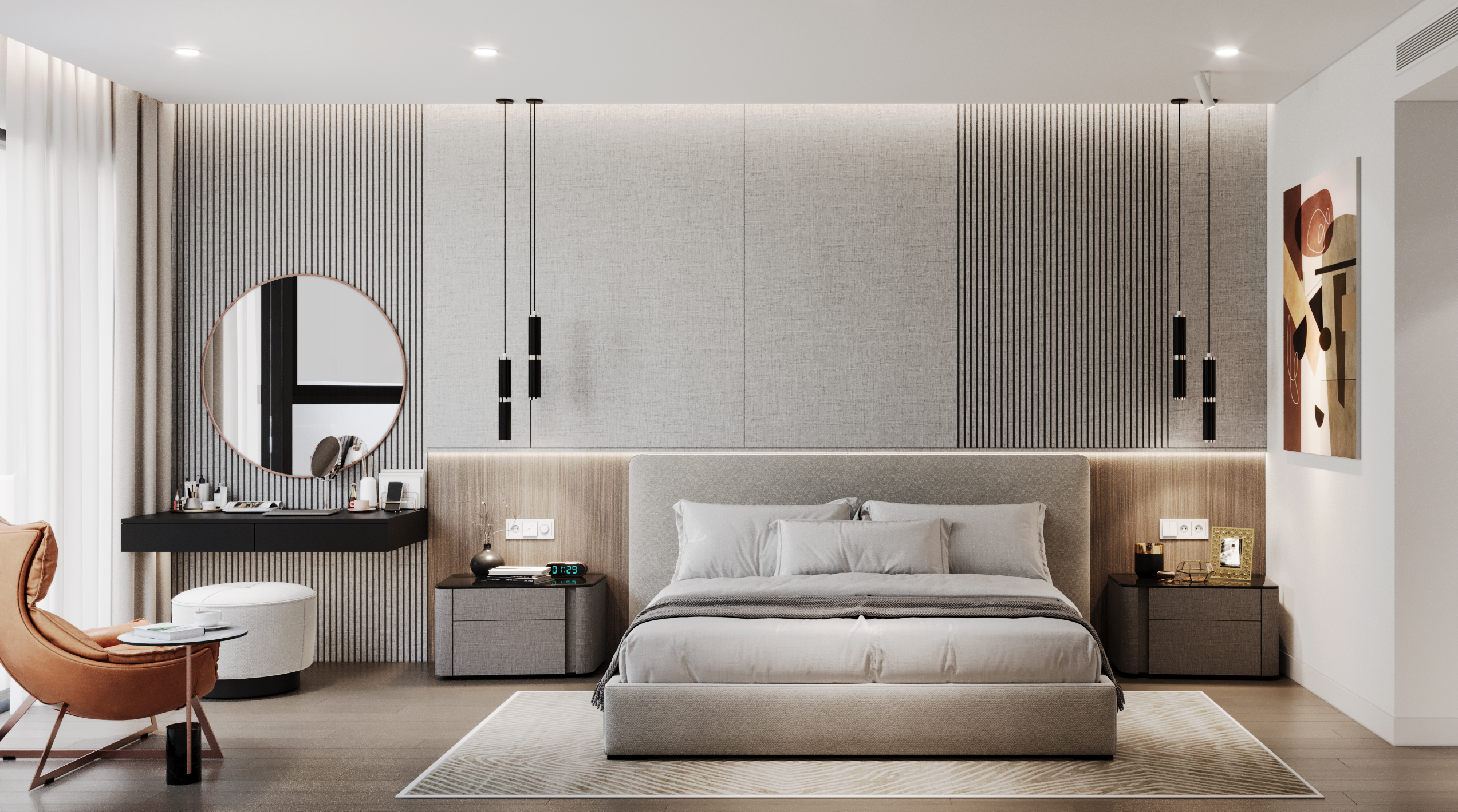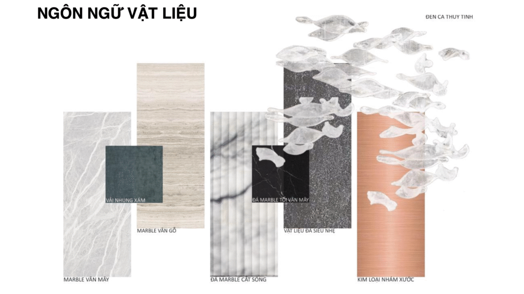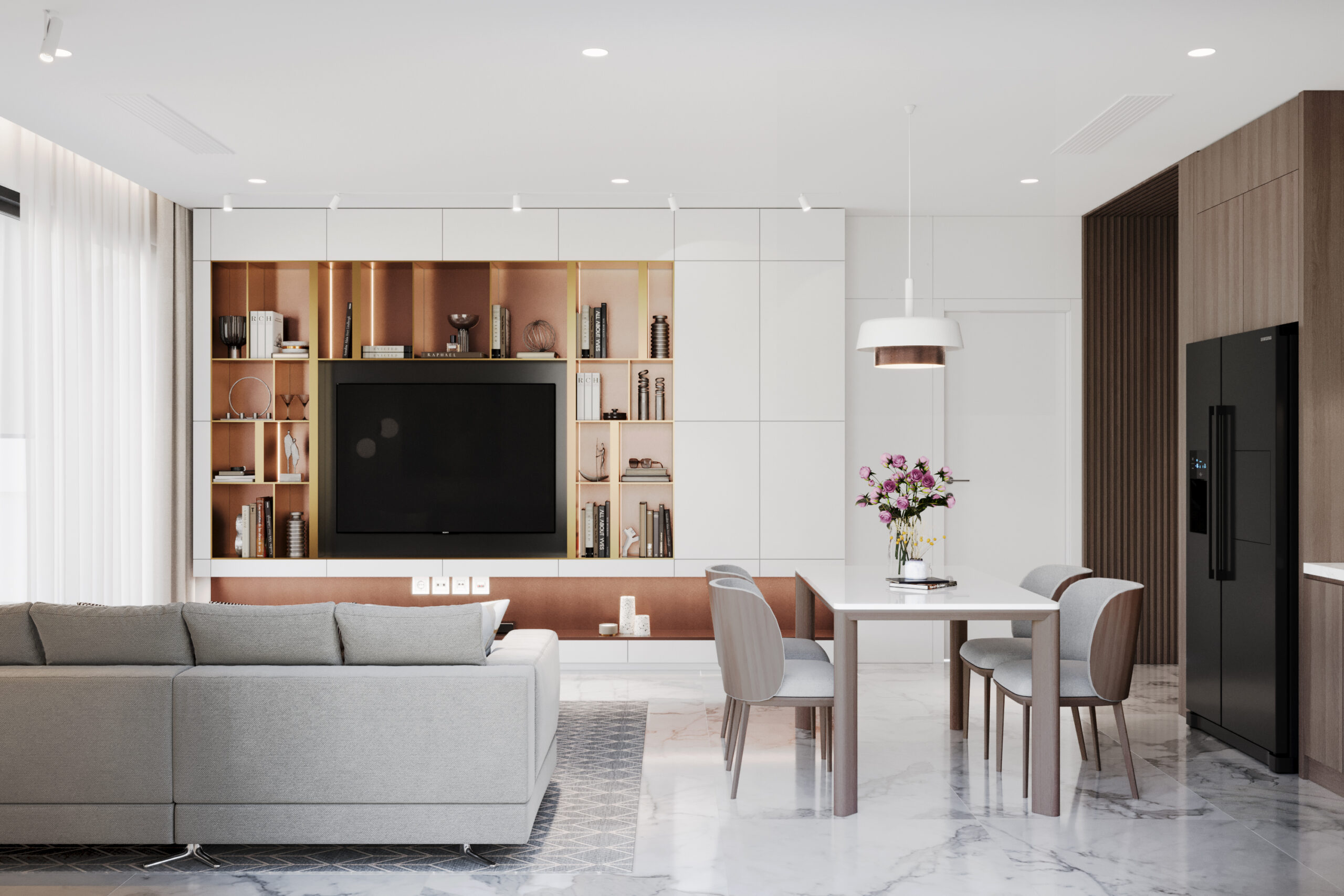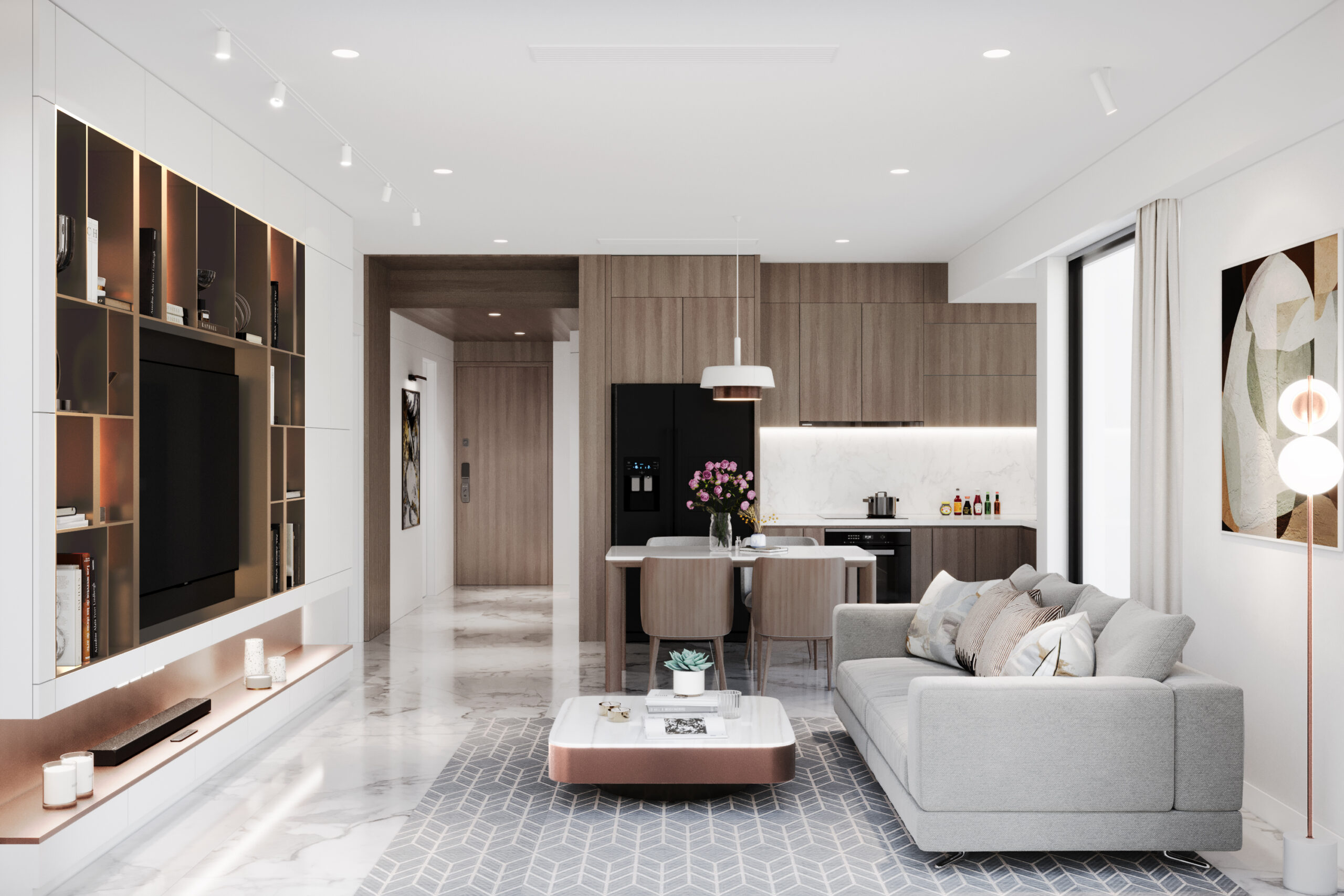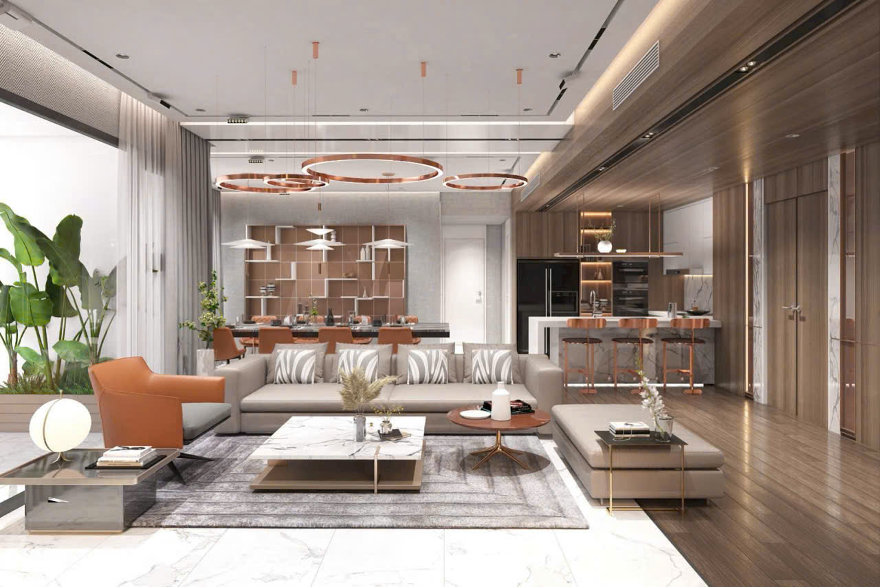 Nội thất được lựa chọn từ những thương hiệu hàng đầu châu Âu, mang đậm phong cách đương đại, tinh giản mà sang trọng. Tông màu trung tính kết hợp vật liệu cao cấp như đá tự nhiên, gỗ óc chó, kính cường lực, mang lại cảm giác ấm cúng nhưng vẫn đẳng cấp.
