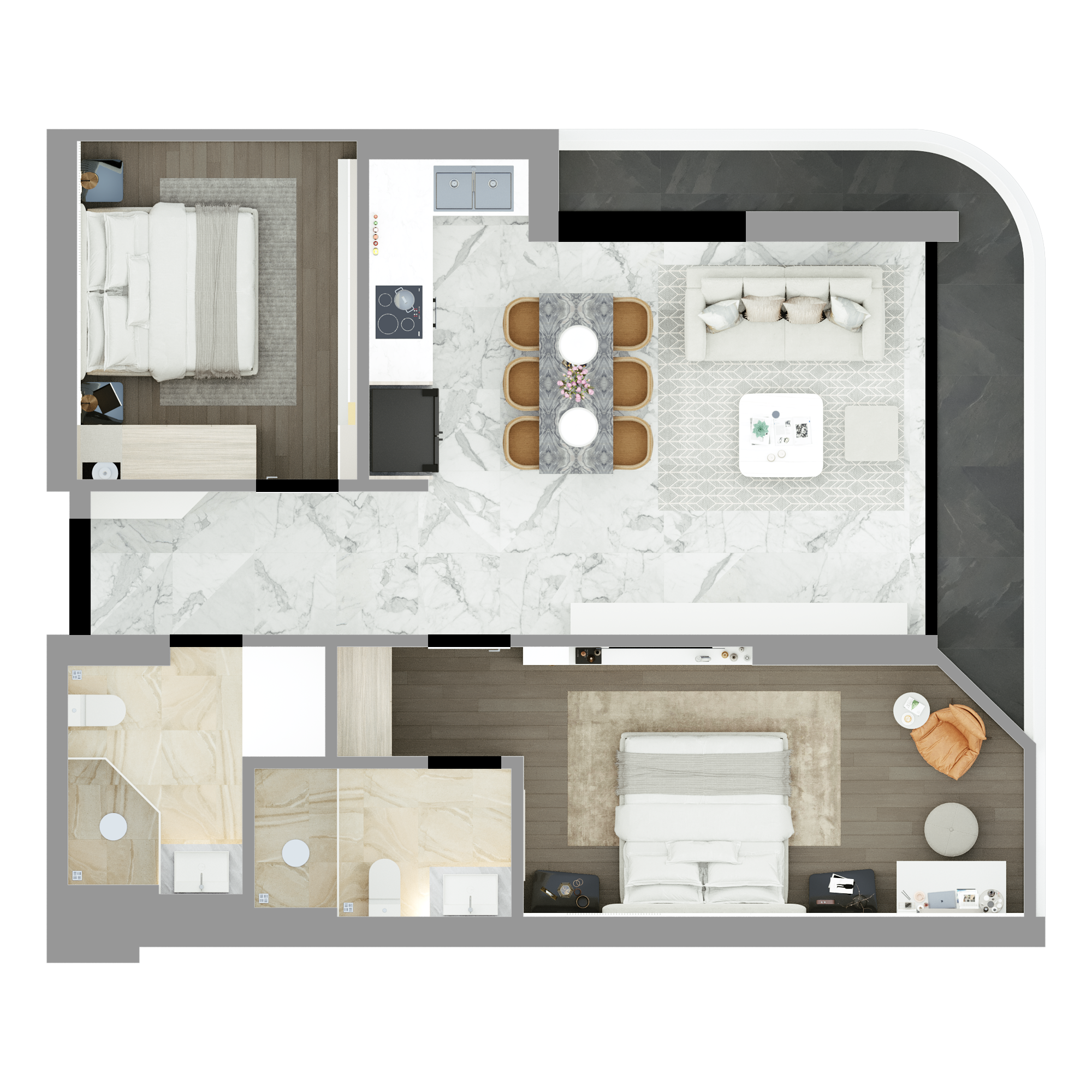 Các căn hộ được bố trí khoa học, diện tích linh hoạt từ 45 m² đến 227 m², đáp ứng nhu cầu đa dạng của gia chủ – từ không gian riêng tư yên tĩnh đến những căn góc sang trọng với tầm nhìn toàn cảnh biển và thành phố.
