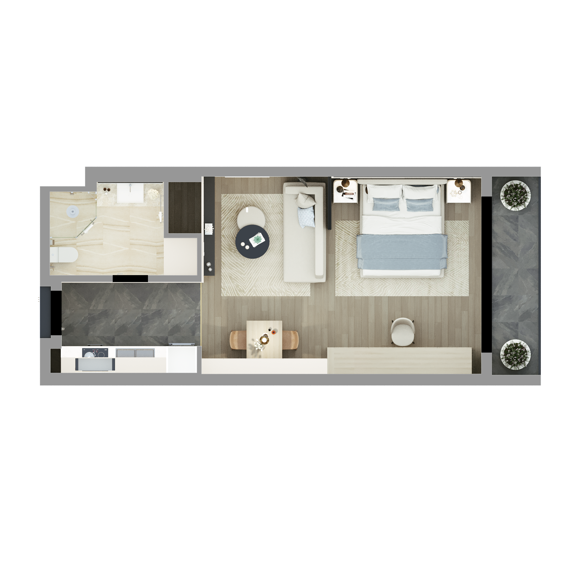 Phòng khách – phòng ngủ – bếp liên hoàn, tạo cảm giác rộng thoáng và tiện nghi.