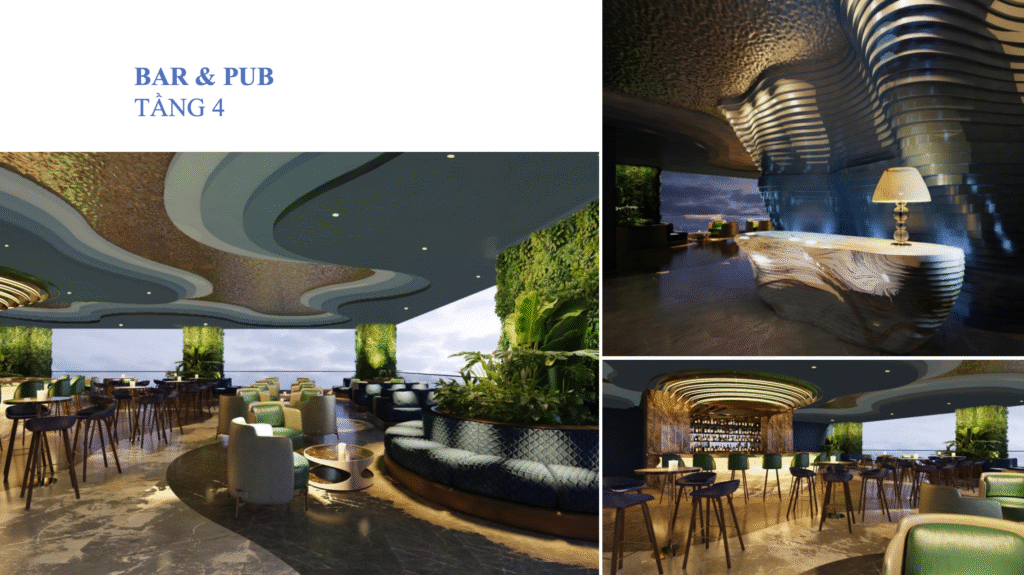 Khối đế thương mại của dự án là trung tâm tiện ích đẳng cấp: nhà hàng, cafe, spa, phòng gym, hồ bơi vô cực, sky bar, khu vườn trên không…