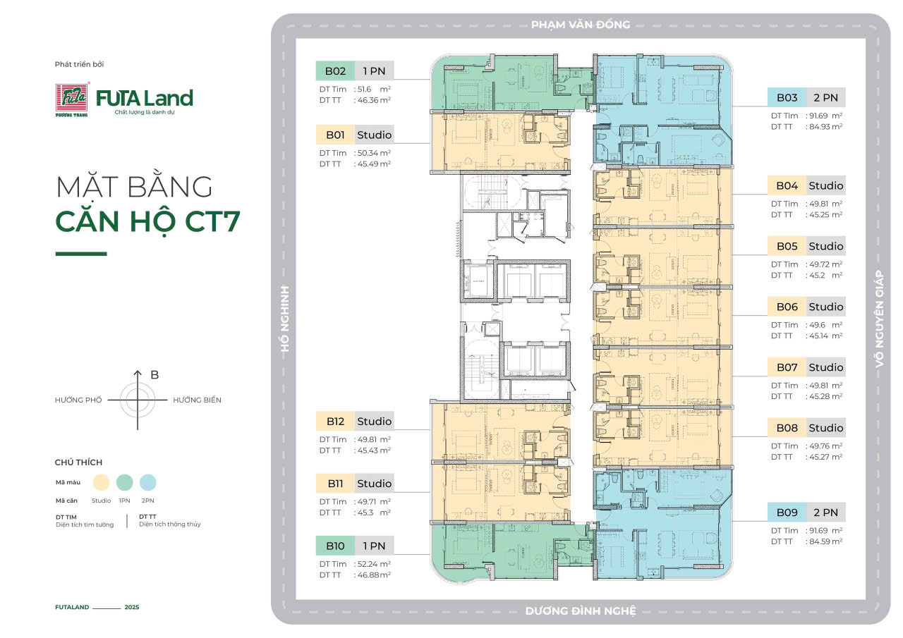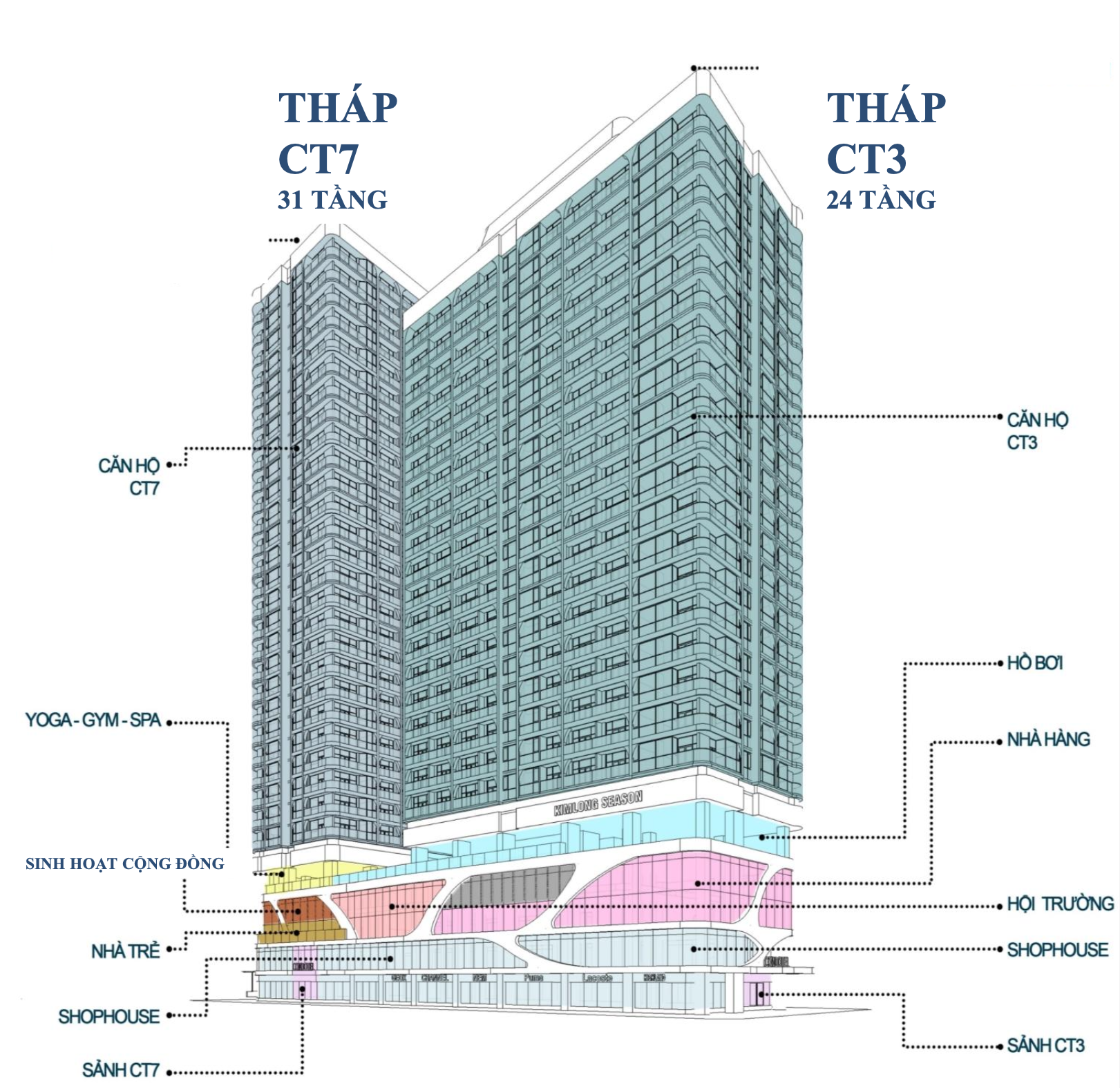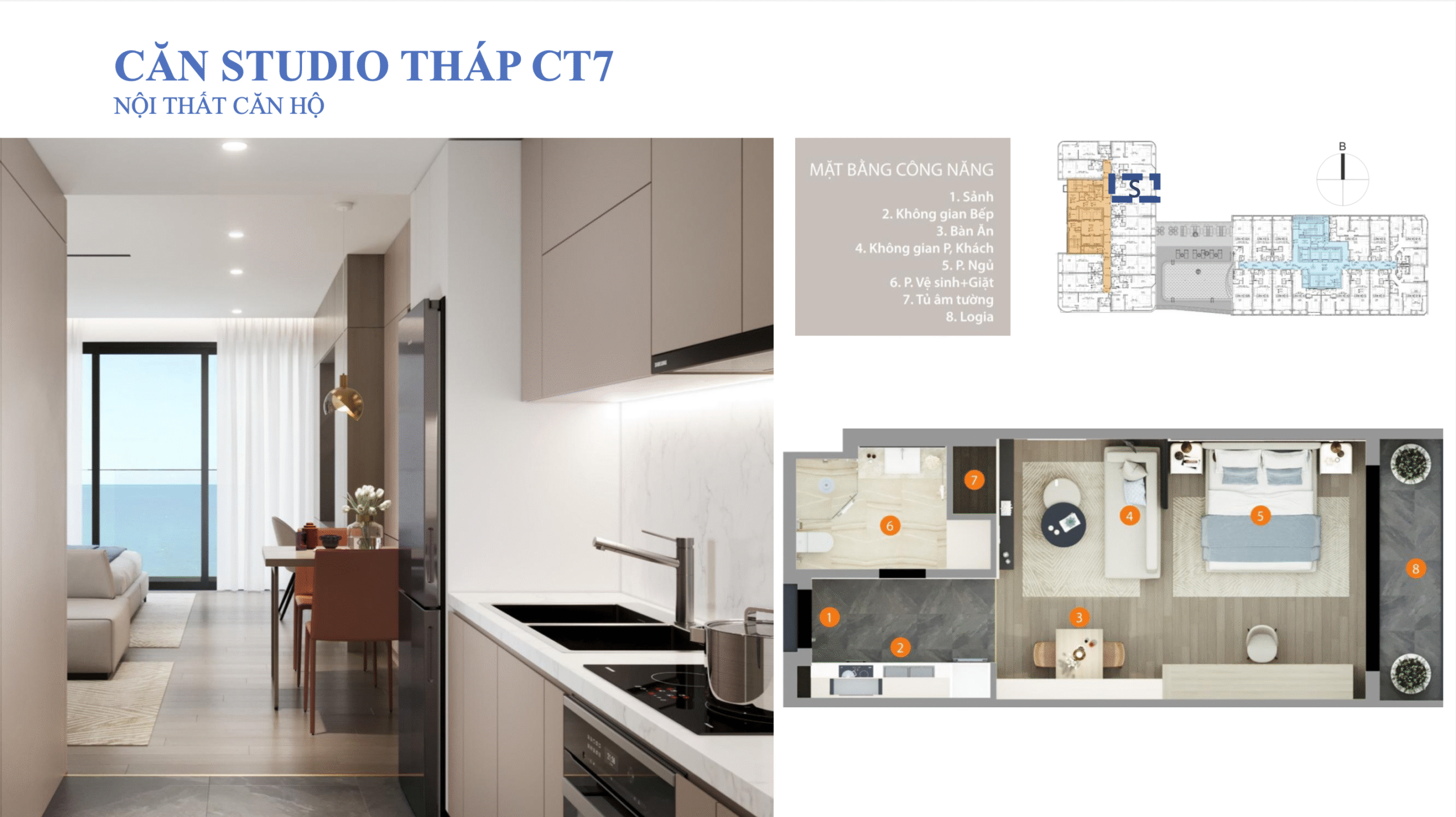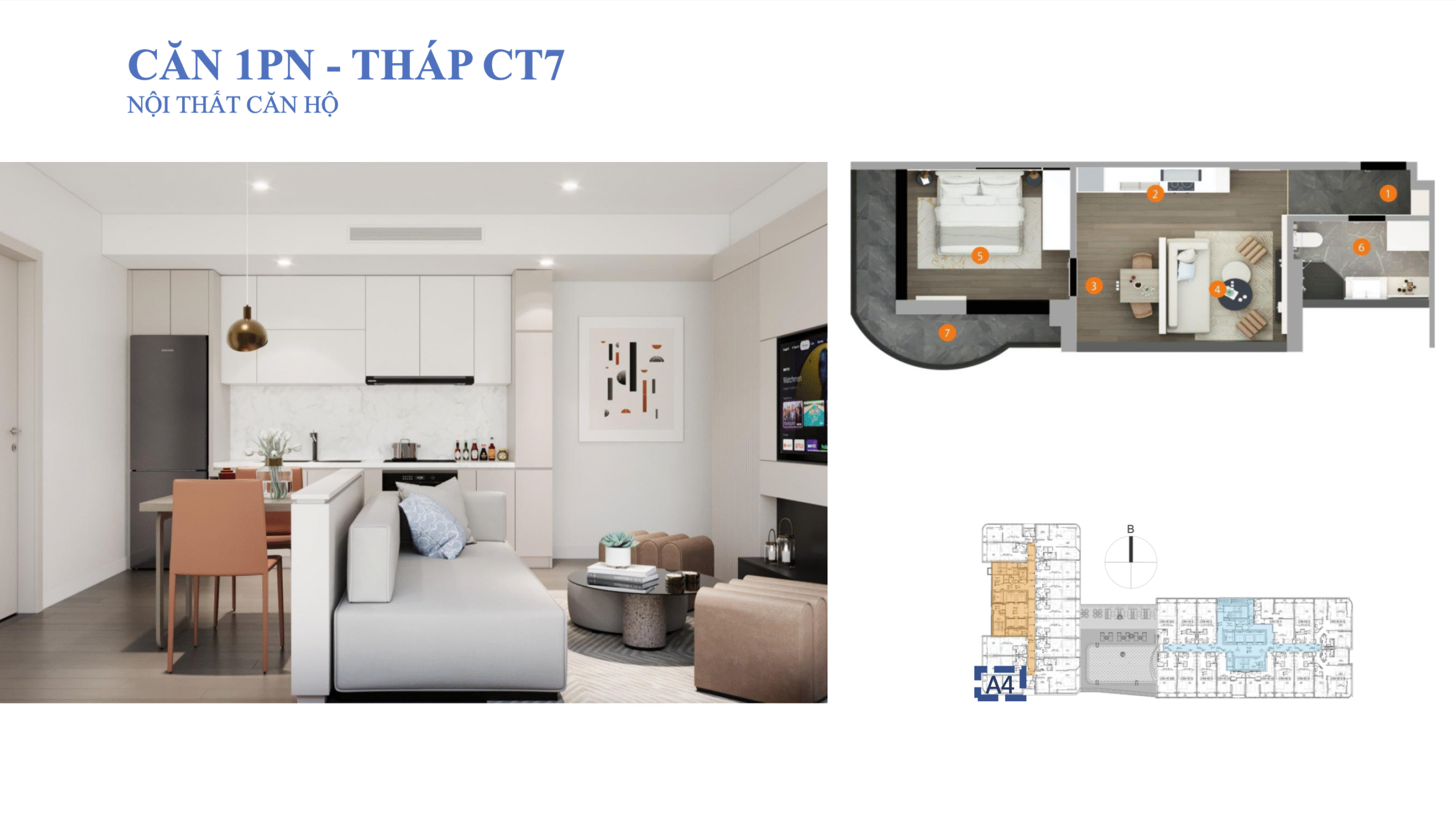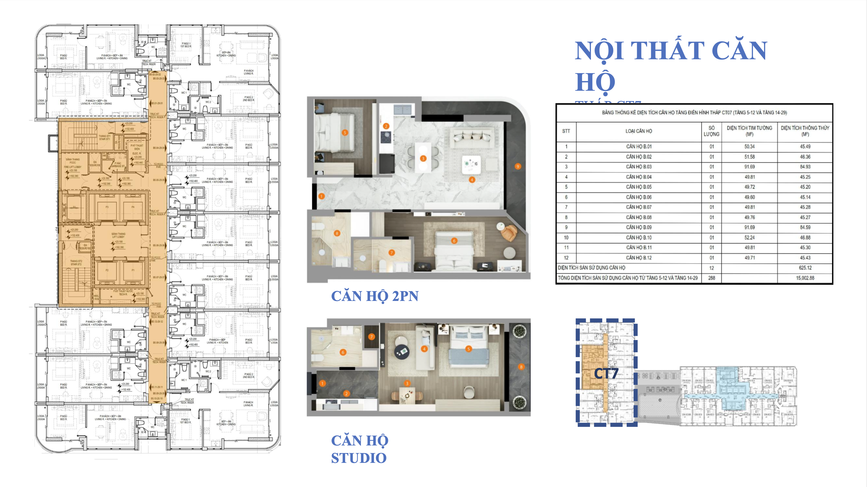 Tòa CT7 có cơ cấu 66% là căn studio và 17% là căn 1 phòng ngủ, còn lại 16% là căn 2 phòng ngủ và 1% là căn 3 phòng ngủ.